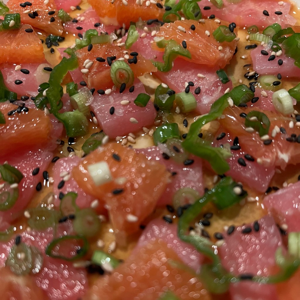 First, you’ll want to rinse your fish and pat it dry with a paper towel. Slice it into thin pieces, and lay it on your plate. Next, with the skin still on, slice your orange and then remove the skin. Chop your orange rounds into bite size pieces, and lay them onto the ahi. Next, the green onion, chop the entire stalk including the white end finely and sprinkle over your plate. The shishito is the last thing to chop, do so very finely and remove the seeds before tossing over the rest on the plate. Drizzle lime juice, then ponzu, then sesame oil. Sprinkle both colors of sesame seeds and add salt, and you’re done! I could eat a pound of this.