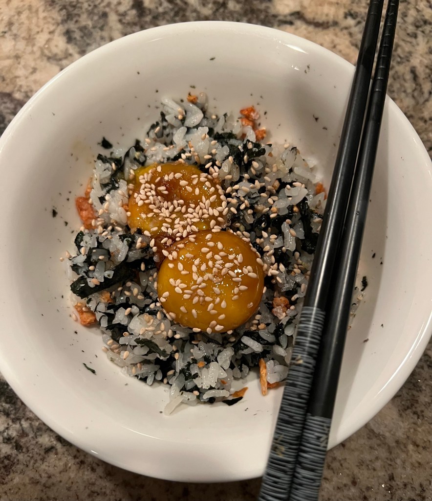At the hour and a half mark, get out the rice cooker. I used my single serve rice cooker for this since I was only preparing one little bowl for myself. Cook your rice, I personally like to add the rice vinegar right into the water when I am cooking my rice. Just a little splash. Once the rice is done cooking, add it to a bowl. Take one sheet of nori and crumble it over the rice, add furikake of choice, and a drizzle of sesame oil. Mix all of this together, and then get out your egg yolks. By this time they will be perfectly cured. Since they were in there for only about 2 hours, they will still be very runny, just a tad thicker than a raw yolk. Be careful not to leave them in the cure for too long, as they will get jammy. Although jammy eggs are delicious, that’s not the texture you want for this dish. We can revisit jammy cured egg yolks later. Scoop your yolks from their soy sauce, and place them on top of your rice. Top with sesame seeds and flaky salt. Mix everything up and enjoy!