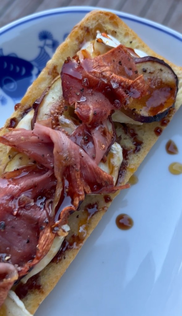 I love a baguette as a vehicle for things you would typically find on a charcuterie board. This is something to make when you want a charcuterie board all at once. Instead of having individual items one at a time you can have them all at the same time with a crispy baguette under them. It is basically an open-face sandwich.