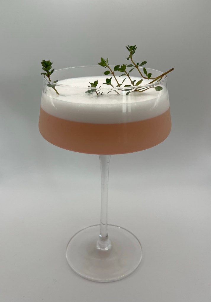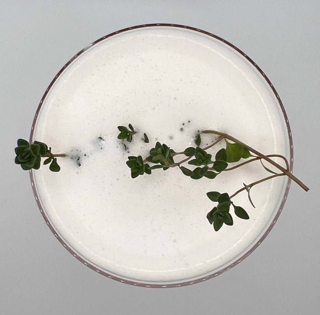 Add all ingredients except lemon thyme to small side of shaker. Blitz with a milk frother for about a minute or until a creamy foam forms. Add lemon thyme sprig. Hard shake. Double strain into a chilled coupe glass. Garnish with a sprig of lemon thyme and serve!