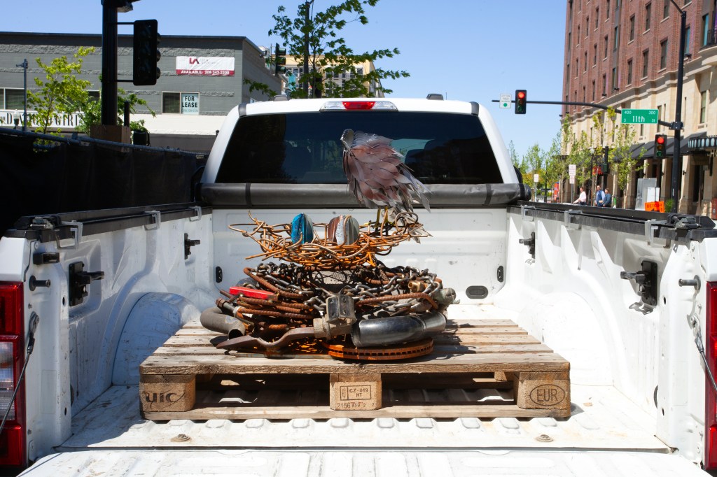 Responding to the statistic from the City of Boise’s Climate Action Roadmap describing the average amount of waste from each Boise household per month, Ott’s work features a Cooper’s hawk on its nest atop a 138-pound pile of trash.