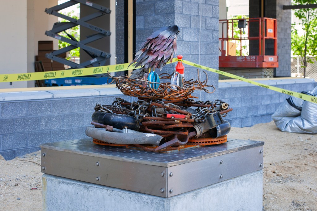 The piece is called One Man’s Trash, and it responds to a statistic from the City of Boise’s Climate Action Roadmap that states the average amount of waste produced by each Boise household per month. That number is 138lb. The artists’ call tasked everyone with responding to this statistic in a way that comments on how it affects ecosystems and the climate. I immediately thought about the landfill, and upon doing more research, found that because of the seagull problem there, birds of prey had to be brought in to deal with them. The most prevalent of these birds of prey is the Cooper’s Hawk. So off I went, to make a Cooper’s Hawk with its nest perched atop a 138lb pile of trash. The eggs in the nest are also made of trash, to symbolize the baby birds being born into this ecosystem that has been forced upon them. I chose Monster cans specifically to comment on how humans are likely seen as monsters by all of the animals whom we’ve forced into ecosystems that are unnatural to them. The hawk still remains majestic, proud and protective of her nest despite her circumstances. She doesn’t seem to have much of a choice in the matter.
