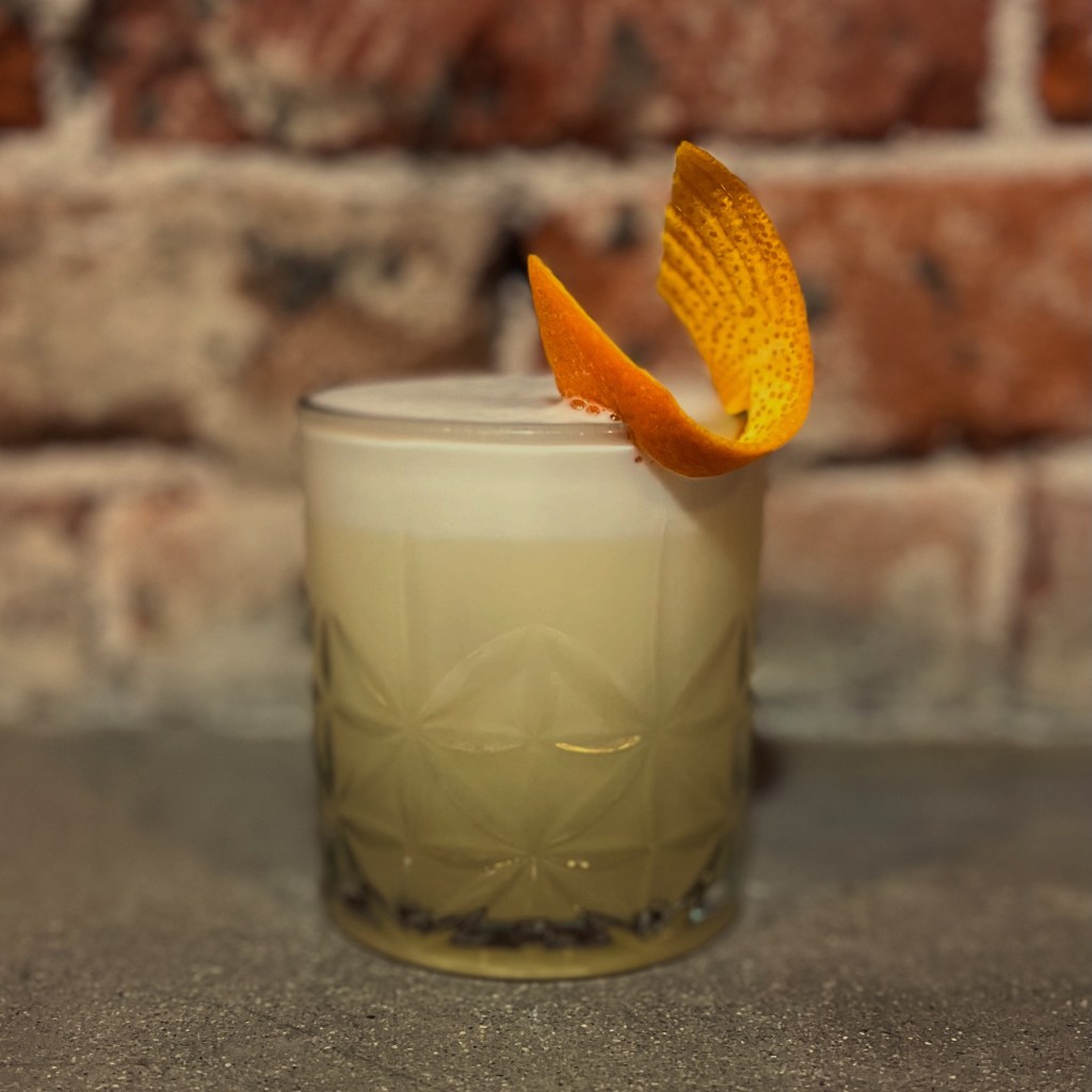 Add all wet ingredients to the small side of the tin, excluding the egg white in the big side. Add ice and hard shake. Double strain contents into the small side of the tin. Dry shake. Strain into a rocks glass over a large rock. Garnish with orange twist in shape of your liking.